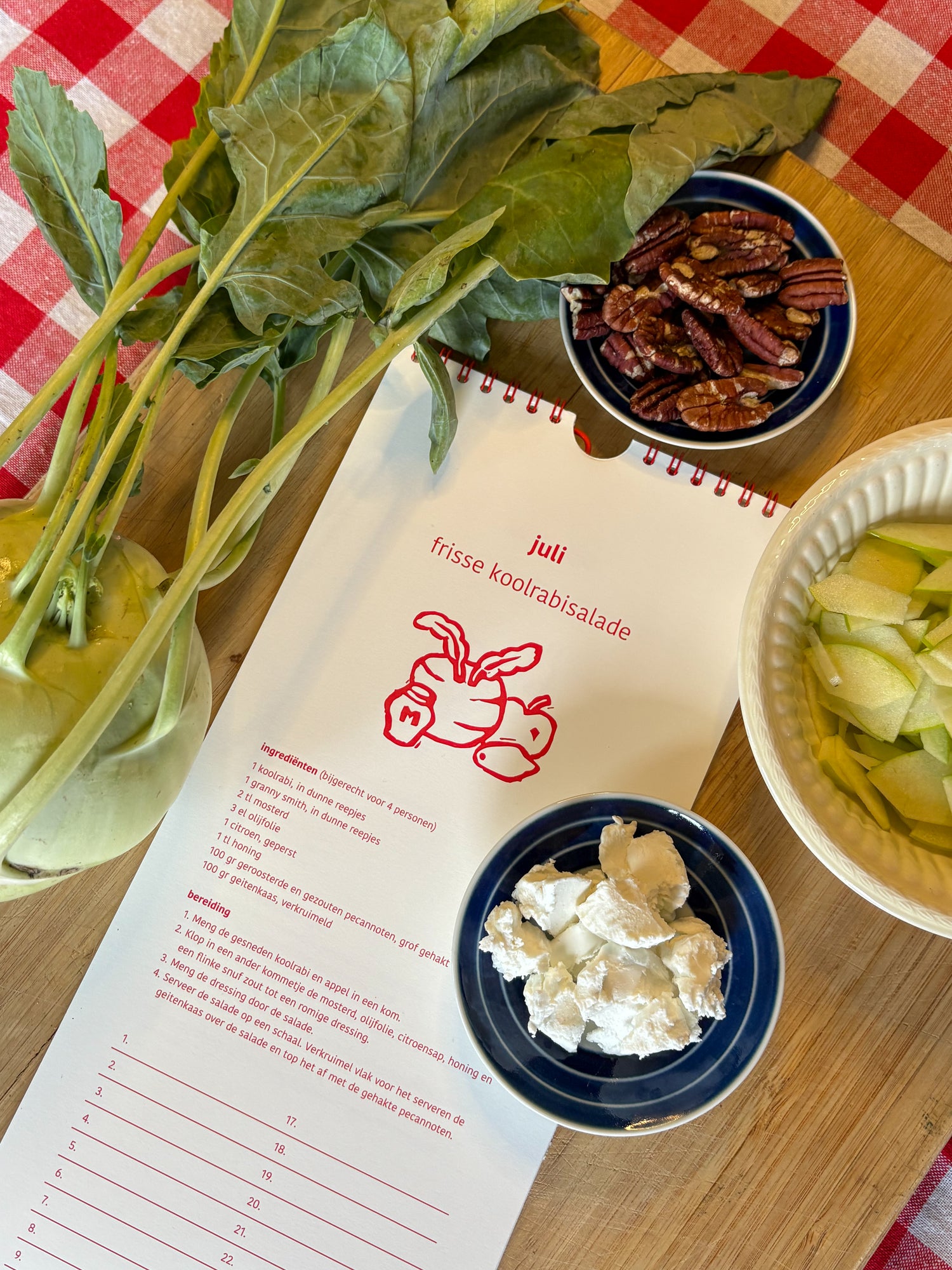 De vergeten groeten kalender is een kalender die je helpt om nooit meer een verjaardag te vergeten en die tegelijkertijd vergeten seizoensgroenten in het zonnetje zet. Elke maand presenteren we een nieuw vega recept met een vergeten seizoensgroente in de hoofdrol. Fransje heeft de illustraties gemaakt met de lino druktechniek en daarna gedigitaliseerd. De kalender is gedrukt op duurzaam geproduceerd papier.